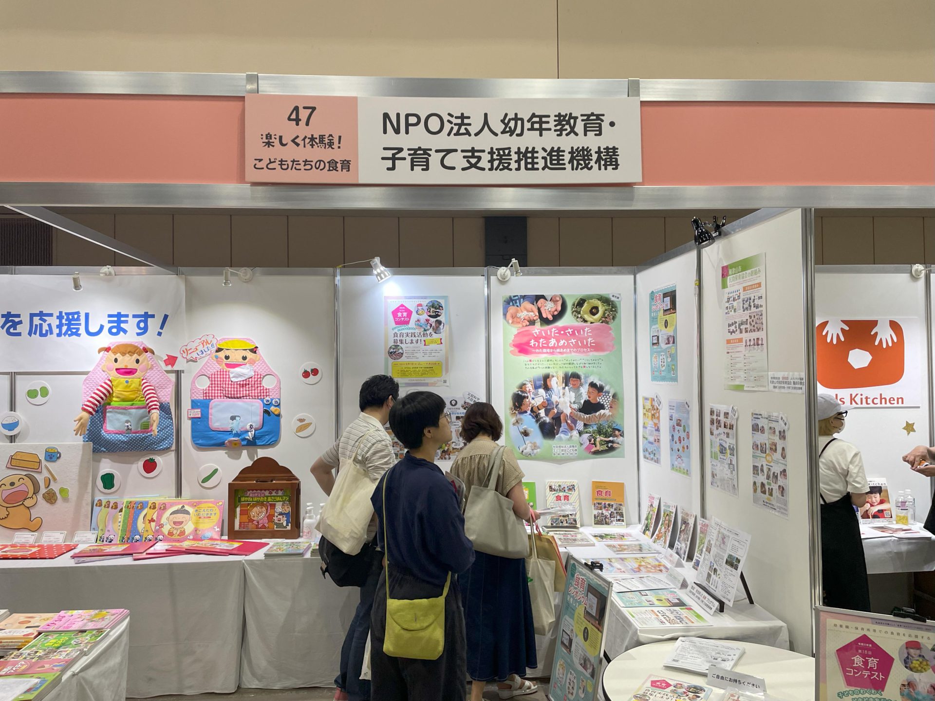 関連企業である株式会社メイトの並びで、第17回食育コンテスト入選園の活動紹介や食育シンポジウムのポスター展示などを行い、ご来場いただいたたくさんの方々に弊機構の食育の取組をご覧いただきました。