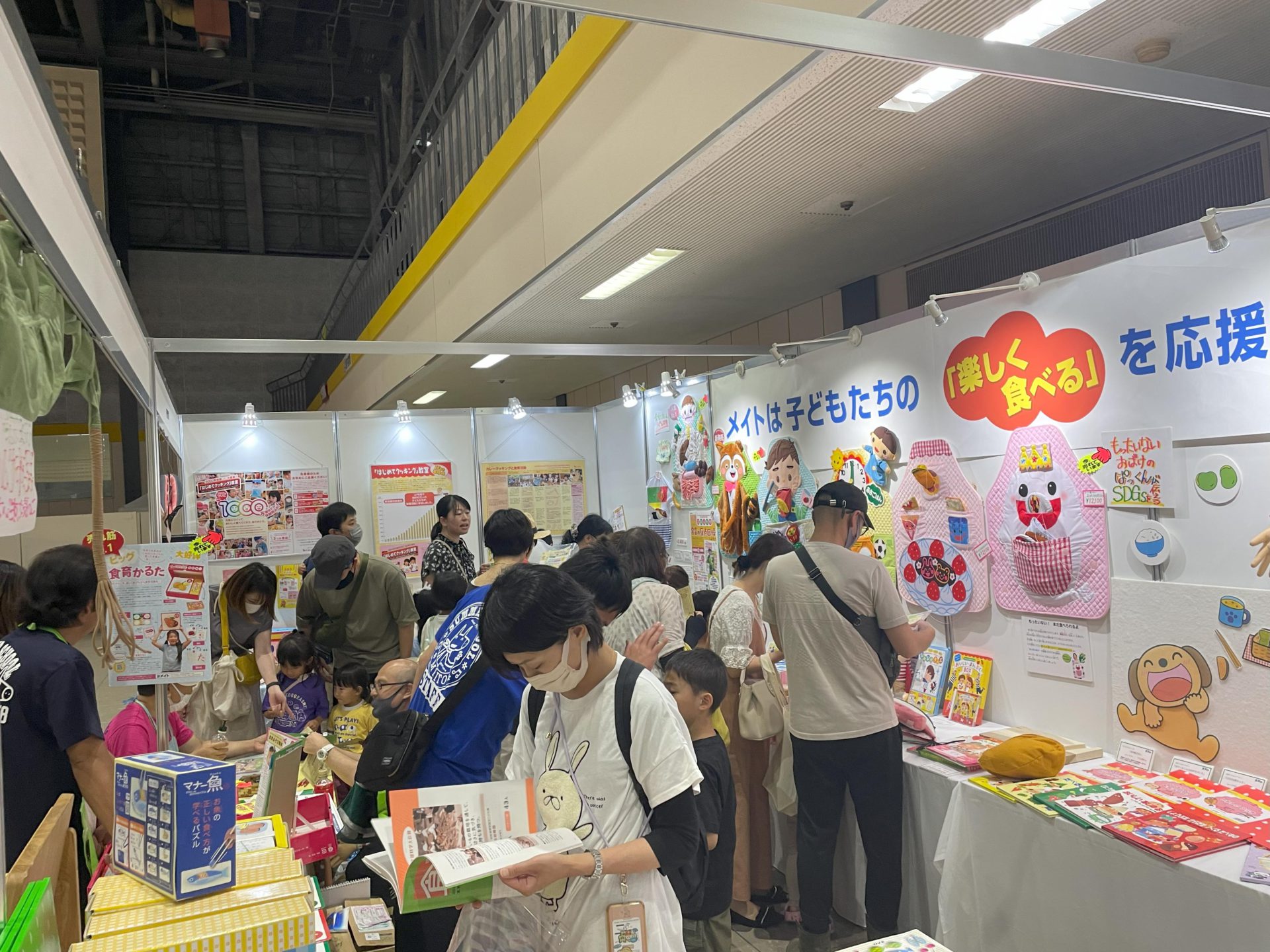 - (株)メイトのブースは、食育教材・書籍などを展示販売。
