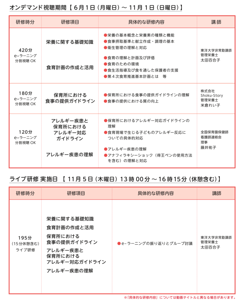 • 他の保育士等に食育・アレルギー対応に関する適切な助言及び指導ができるよう、実践的な能力を身に付ける。
