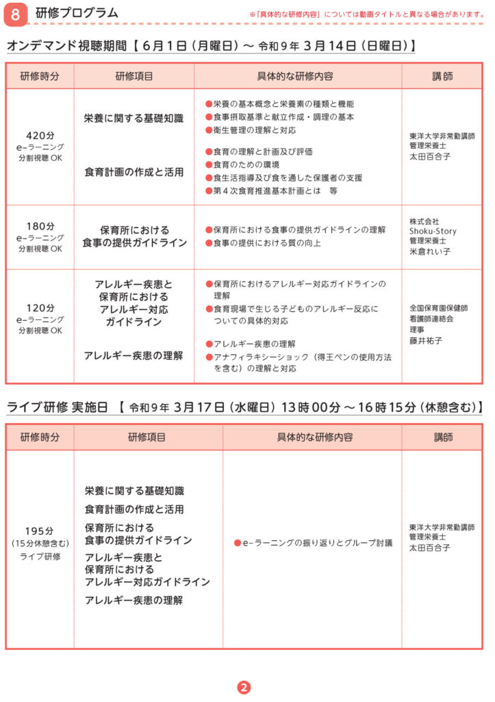 - 他の保育士等に食育・アレルギー対応に関する適切な助言及び指導ができるよう、実践的な能力を身に付ける。